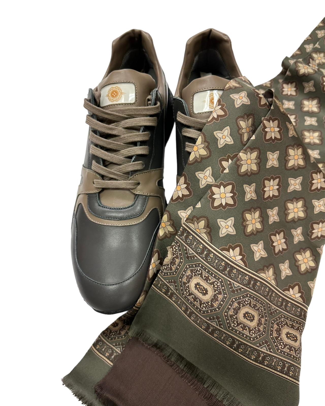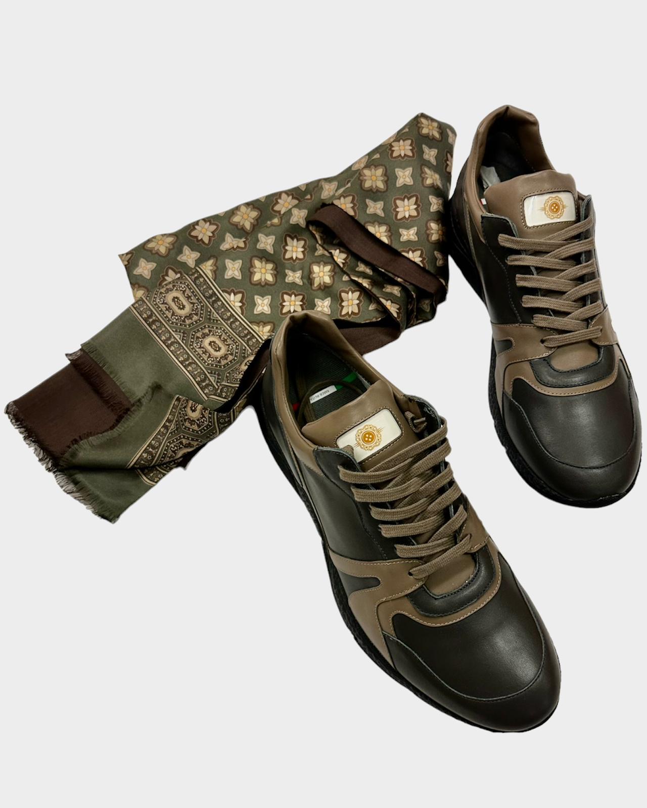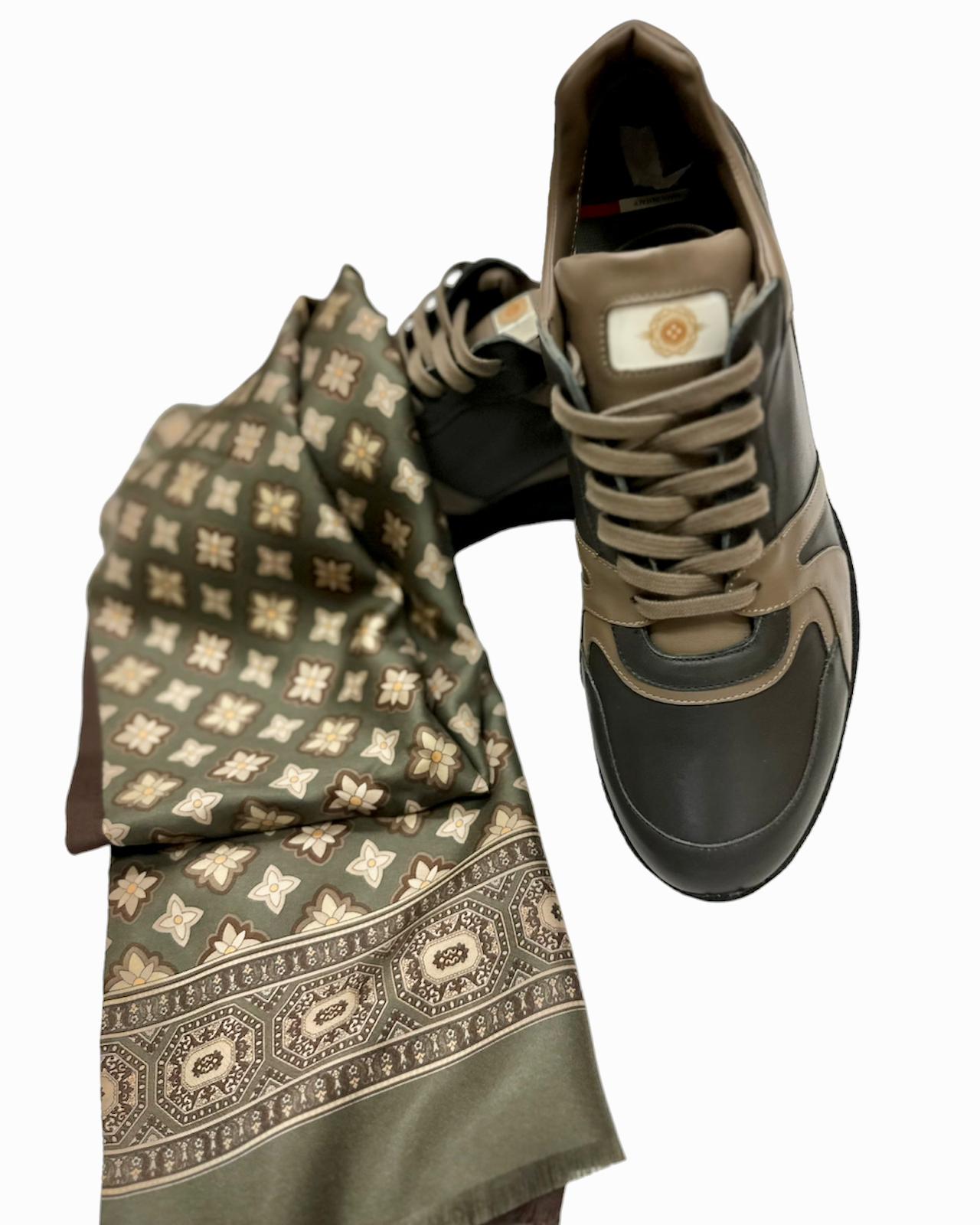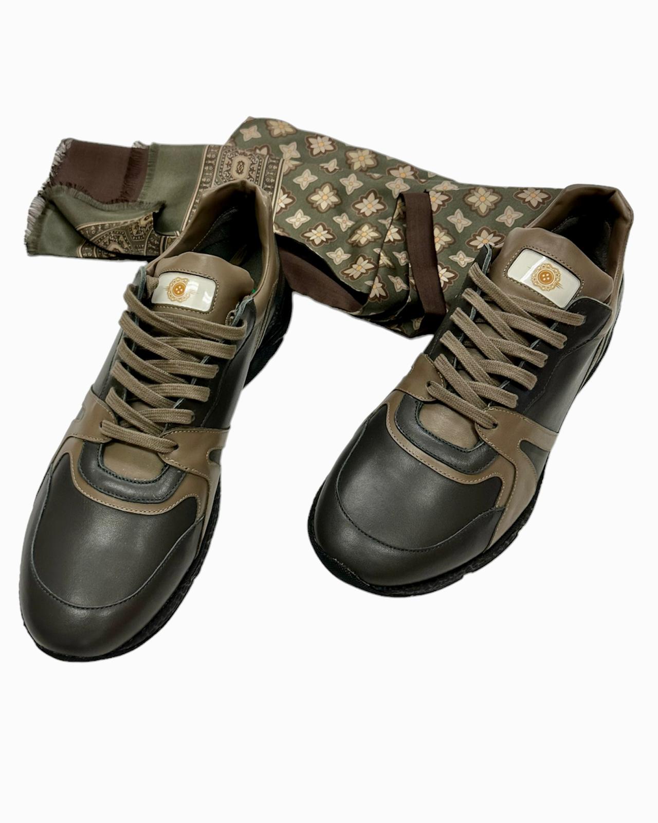Handmade Italian sneaker perfectly combines a beautiful earth tone leather on shark gray leather combo fit for the Plain Clothed Millionaire in you!